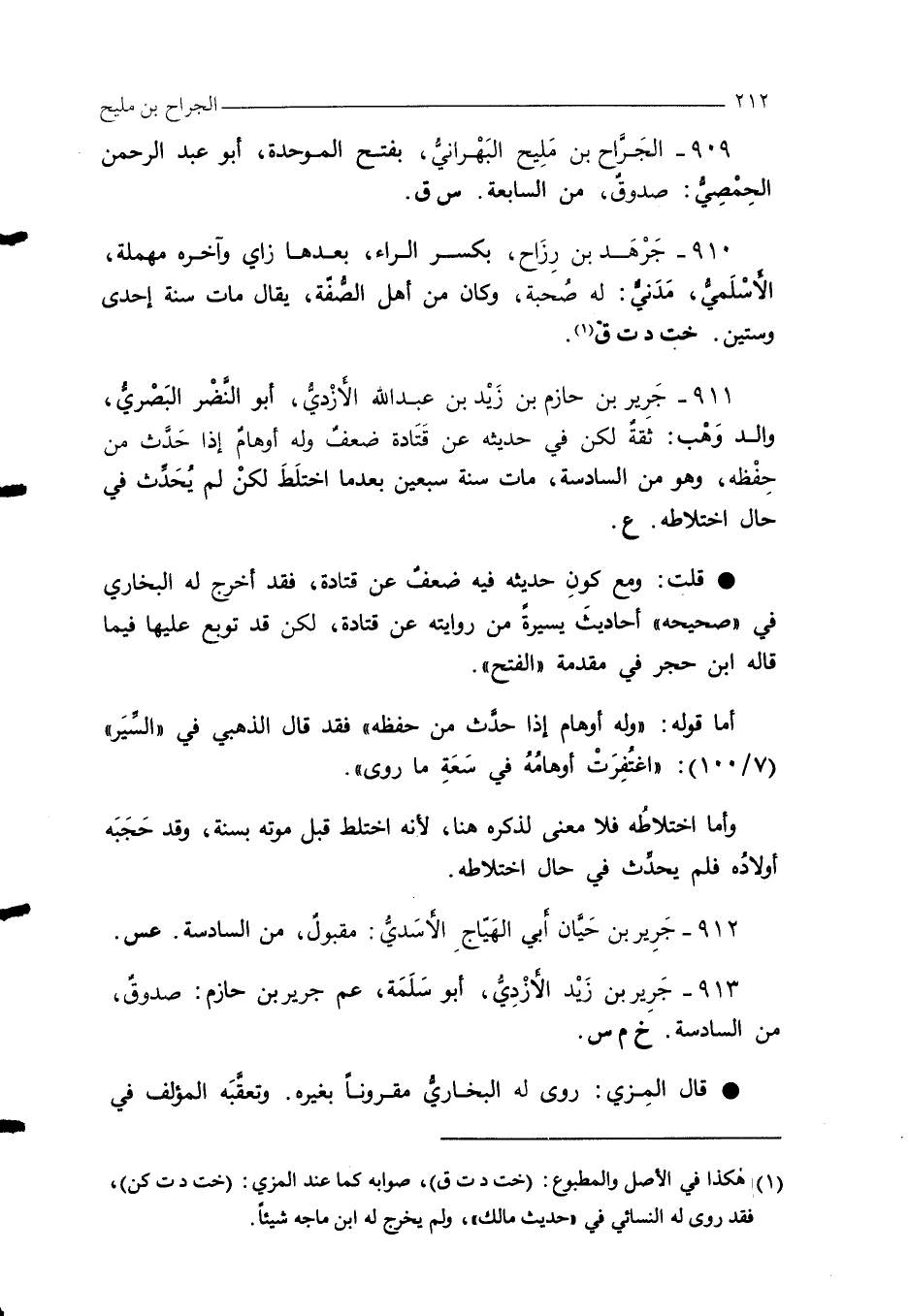 911 - جَرِير بن حازم بن زَيْد بن عبد الله الأزْديُّ، أبو النَّضْر البَصْريُّ، والد وَهْب: ثقةٌ لكن في حديثه عن قَتَادة ضعفٌ وله أوهامٌ إذا حَدَّث من حِفْظه، وهو من السادسة، مات سنة سبعين بعدما اختلَطَ لكنْ لم يُحَدِّث في حال اختلاطه. ع.