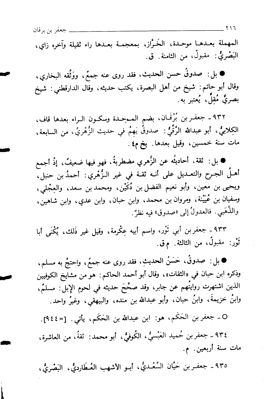 932 - جعفر بن بُرقَان، بضم الموحدة وسكون الراء بعدها قاف، الكِلابيُّ، أبو عبد الله الرَّقِّيُّ: صدوقٌ يَهِمُ في حديث الزُّهْريِّ، من السابعة، مات سنة خمسين، وقيل بعدها. بخ م 4.