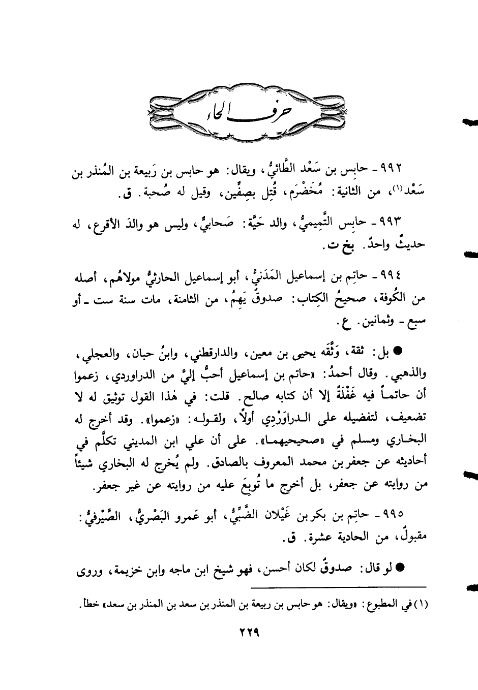 992 - حابس بن سعد الطائي، ويقال: هو حابس بن ربيعة بن المنذر بن سعد (¬1)، من الثانية: مُخضرم، قتل بصفين، وقيل له صُحبة. ق.