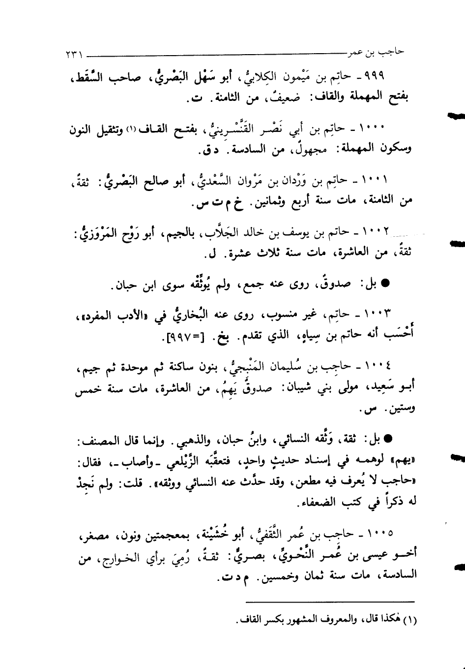 1003 - حاتم، غير منسوب، روي عنه البخاري في "الأدب المفرد"، أحسب أنه حاتم بن سياهٍ، الذي تقدم. بخ. [= 997].