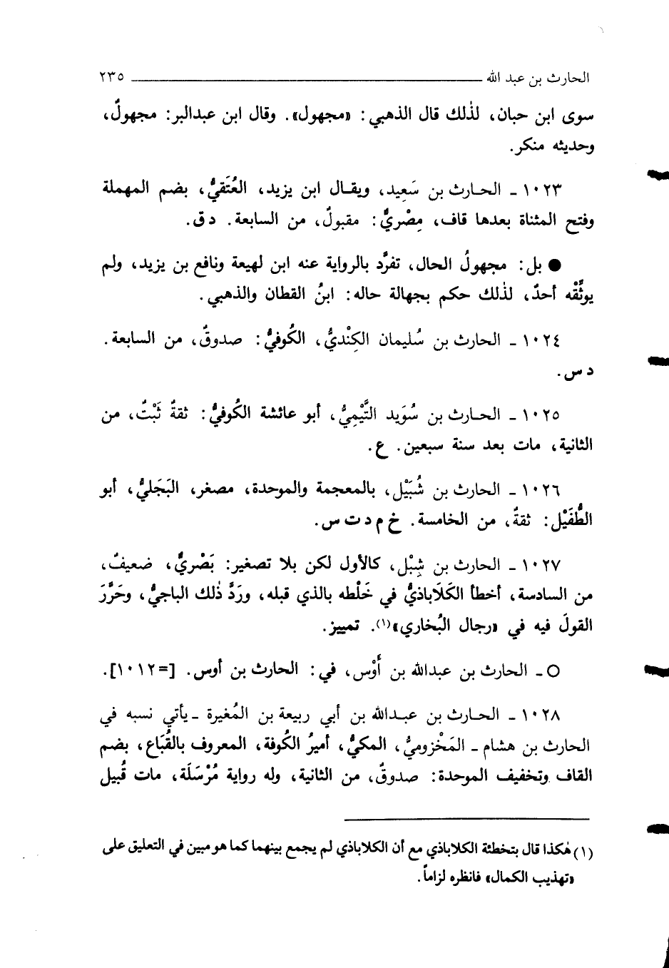 1027 - الحارث بن شِبل، كالأول لكن بلا تصغير: بصري، ضعيف، من السادسة، أخطأ الكلاباذي في خلطه بالذي قبله، وردَّ ذلك الباجي، وحرّر القول فيه في "رجال البخاري" (¬1). تمييز.
