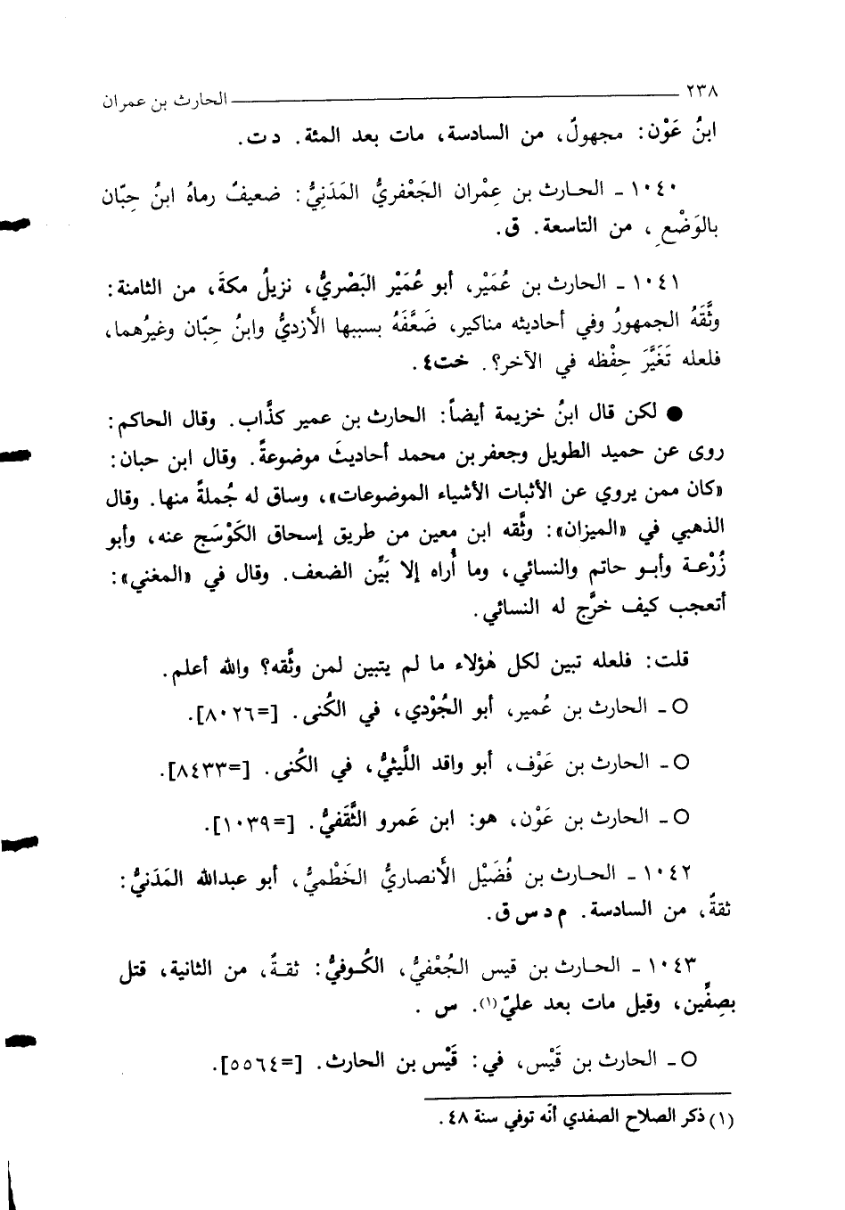 1041 - الحارث بن عُمير، أبو عُمير البصري، نزيل مكة، من الثامنة: وثقهُ الجمهور وفي أحاديثه مناكير، ضعَّفه بسببها الأزدي وابن حِبان وغيرهما، فلعله تغير حفظه في الآخر؟ . خت 4.
