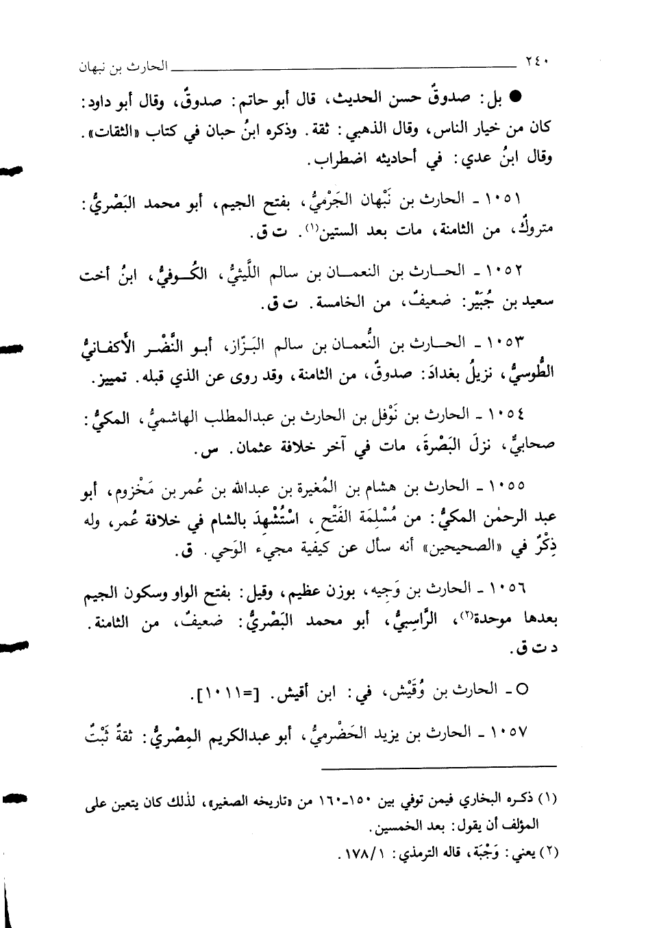 1051 - الحارث بن نَبْهان الجَرْمي، بفتح الجيم، أبو محمد البصري: متروك، من الثامنة، مات بعد الستين (¬1). ت ق.