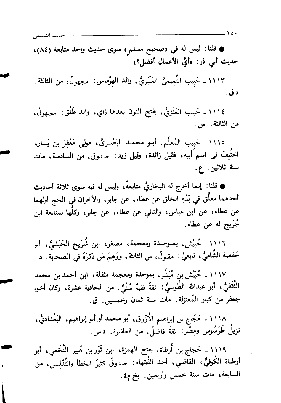 1117 - حُبَيْش بن مُبَشِّر، بموحدة ومعجمة مثقلة، ابن أحمد بن محمَّد الثَّقَفيُّ، أبو عبد الله الطُّوسيُّ: ثقةٌ فقيهٌ سُنِّيٌّ، من الحادية عشرة، وكان أخوه جعفر من كبار المُعتزلة، مات سنة ثمان وخمسين. ق.