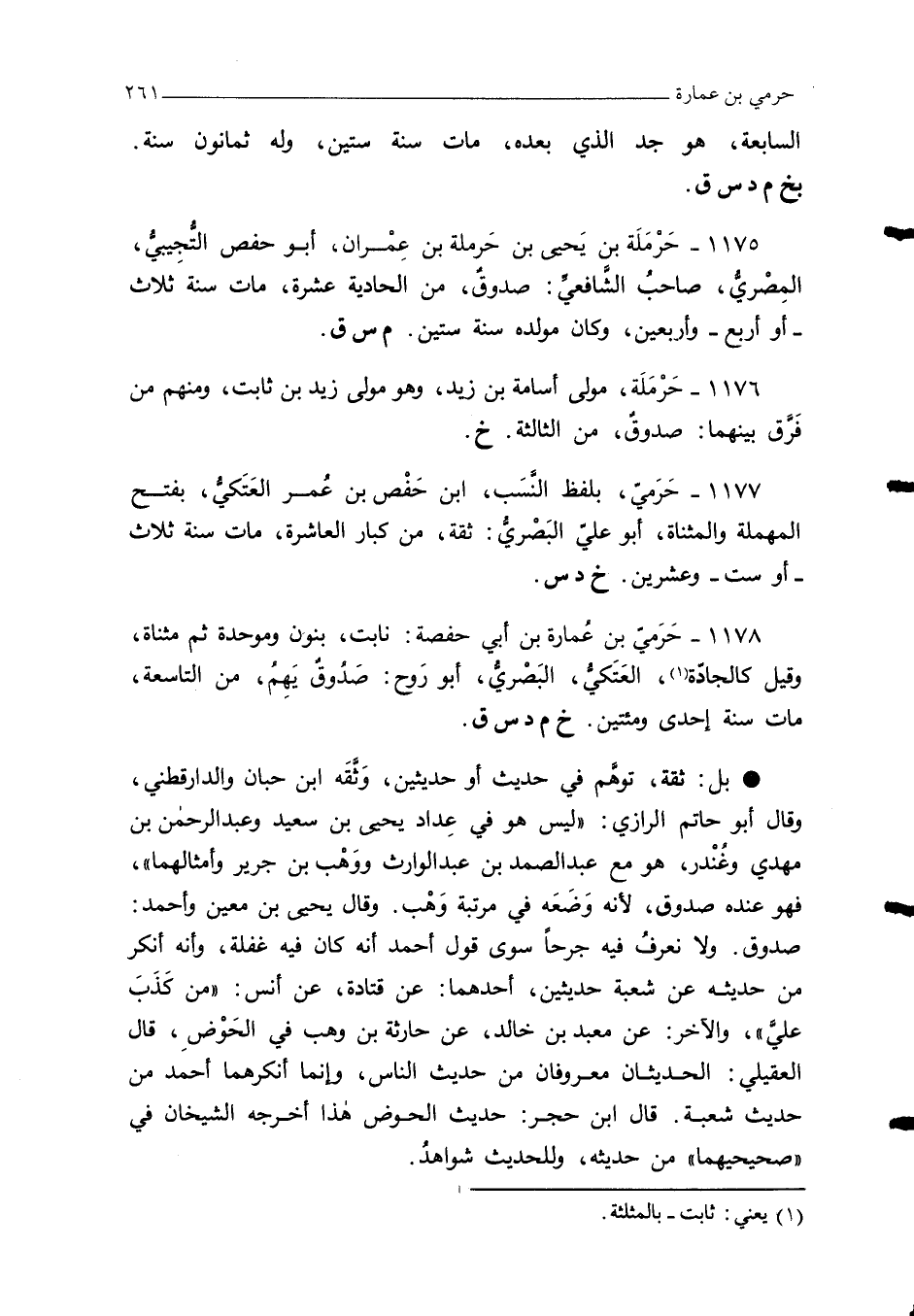 1176 - حَرْمَلَة، مولى أسامة بن زيد، وهو مولى زيد بن ثابت، ومنهم من فَرَّق بينهما: صدوقٌ، من الثالثة. خ.