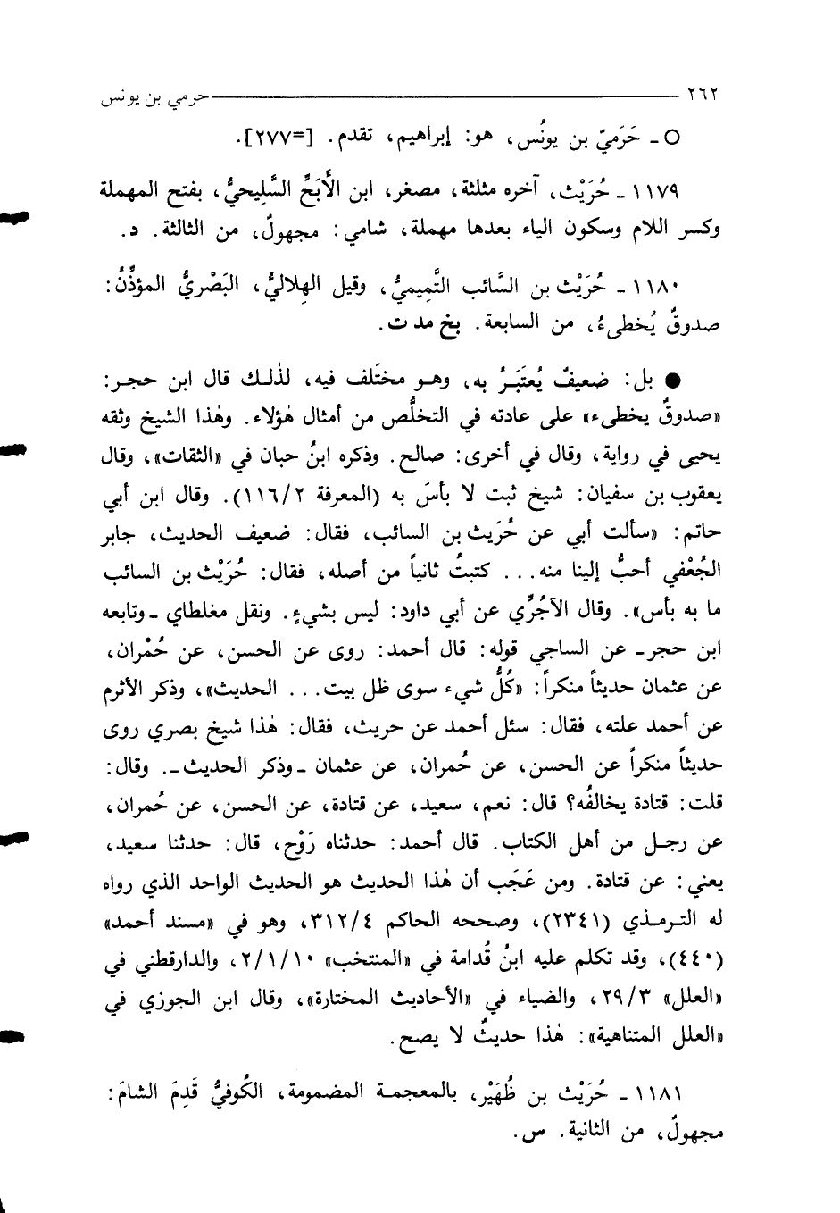1179 - حُرَيْث، آخره مثلثة، مصغر، ابن الأَبَحِّ السَّلِيحيُّ، بفتح المهملة وكسر اللام وسكون الياء بعدها مهملة، شامي: مجهولٌ، من الثالثة. د.