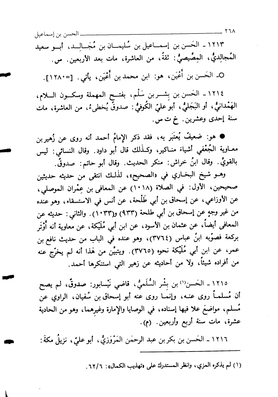 1213 - الحَسن بن إسماعيل بن سُليمان بن مُجَالِد، أبو سعيد المُجالِديُّ، المِصِّيصيُّ: ثقةٌ، من العاشرة، مات بعد الأربعين. س.