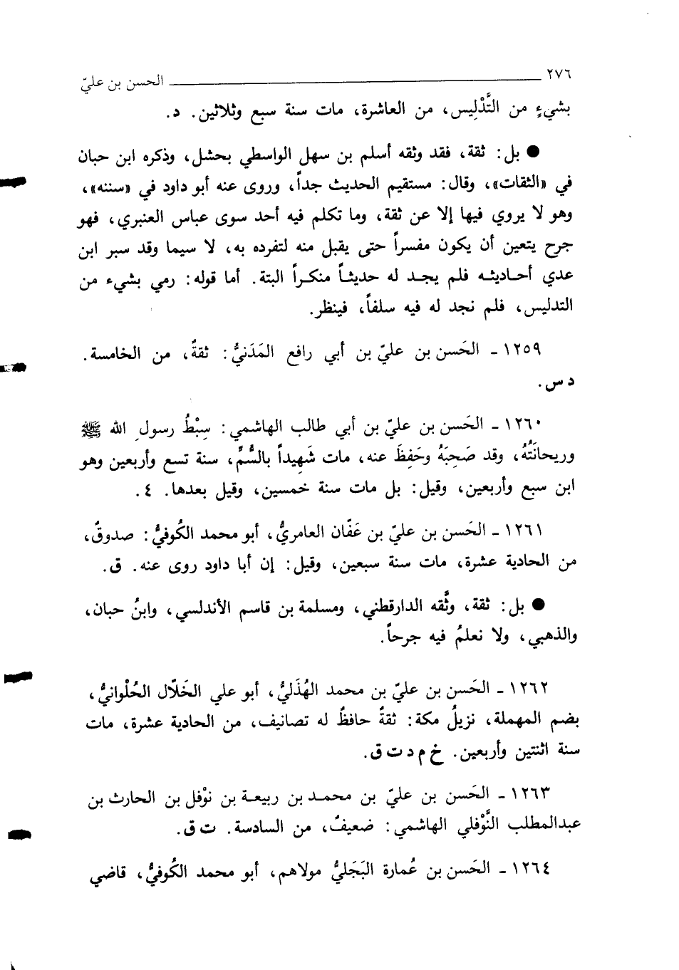1263 - الحَسن بن عليّ بن محمد بن ربيعة بن نوْفل بن الحارث بن عبد المطلب النَّوْفلي الهاشمي: ضعيفٌ، من السادسة. ت ق.