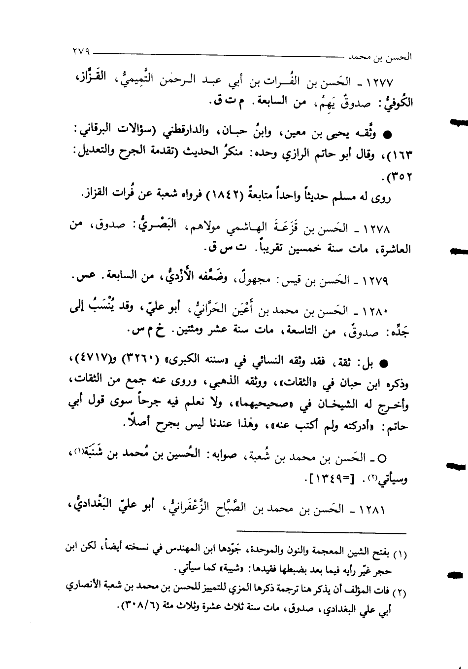 1277 - الحَسن بن الفُرات بن أبي عبد الرحمن التَّمِيميُّ، القَزَّاز، الكُوفيُّ: صدوقٌ يَهمُ، من السابعة. م ت ق.
