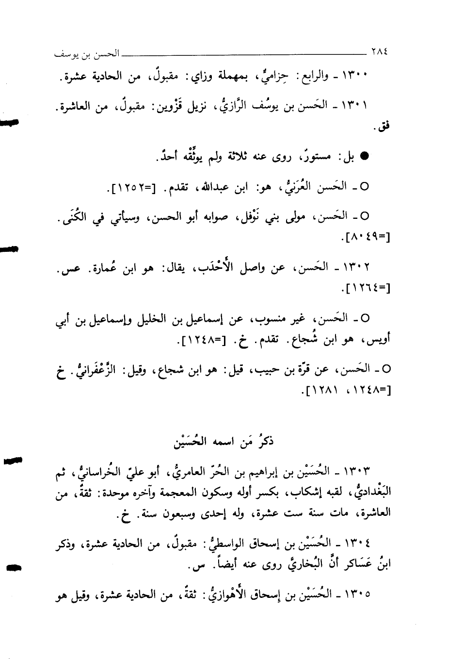 1305 - الحُسَيْن بن إسحاق الأَهْوازيّ: ثقةٌ، من الحادية عشرة، وقيل هو