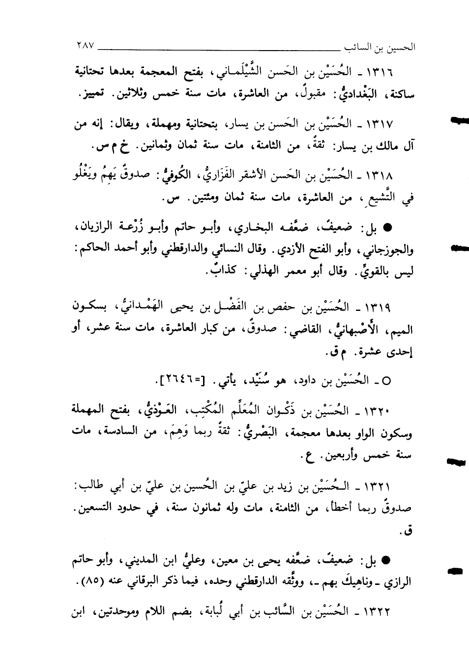 1316 - الحُسيْن بن الحَسن الشَّيْلَمانيّ، بفتح المعجمة بعدها تحتانية ساكنة، البَغْداديُّ: مقبولٌ، من العاشرة، مات سنة خمس وثلاثين. تمييز.
