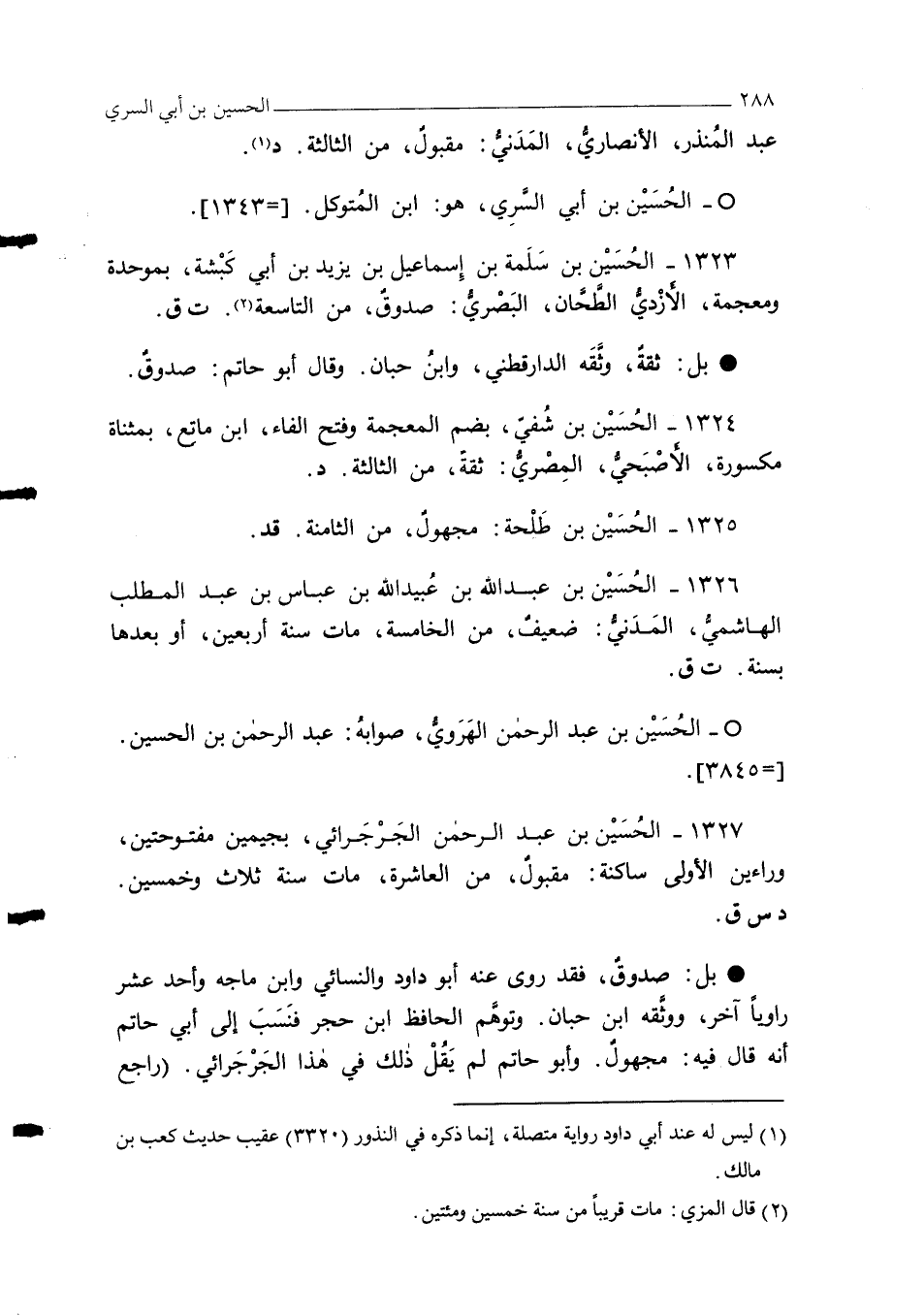 1327 - الحُسَيْن بن عبد الرحمن الجَرْجَرائيُّ، بجيمين مفتوحتين، وراءين الأول ساكنة: مقبولٌ، من العاشرة، مات سنة ثلاث وخمسين. د س ق.