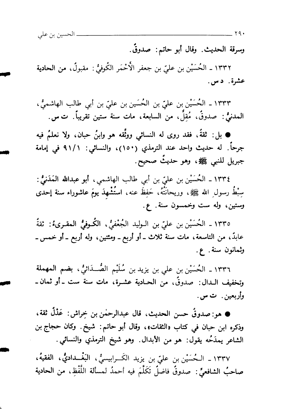 1333 - الحُسيْن بن علي بن الحُسيْن بن عليّ بن أبي طالب الهاشميُّ، المَدَنيُّ: صدوقٌ، مقِلٌّ، من السابعة، مات سنة ستين تقريبًا. ت س.