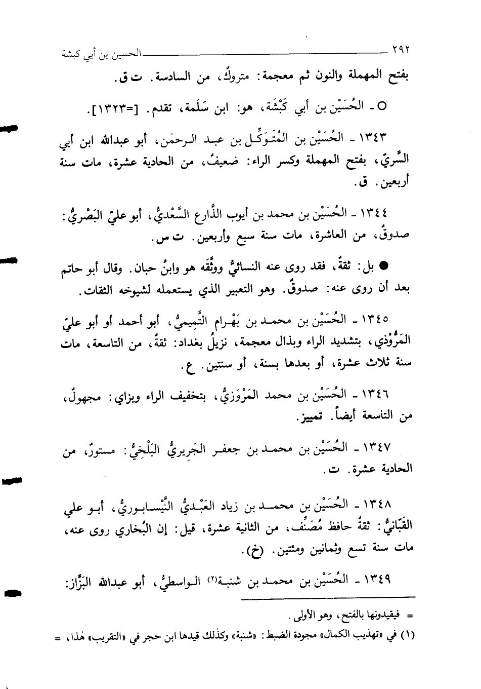 1346 - الحُسَيْن بن محمد المَرْوَزيُّ، بتخفيف الراء وبزاي: مجهولٌ، من التاسعة أيضًا. تمييز.
