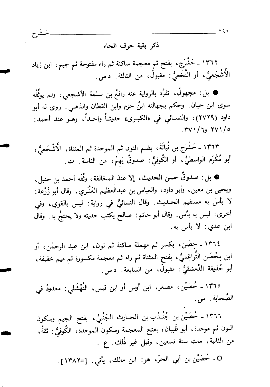 1363 - حَشْرَج بن نُباتَةَ، بضم النون ثم الموحدة ثم المثناة، الأشْجَعيُّ، أبو مُكْرَم الواسطيُّ، أو الكُوفيُّ: صدوقٌ يَهِم، من الثامنة. ت.