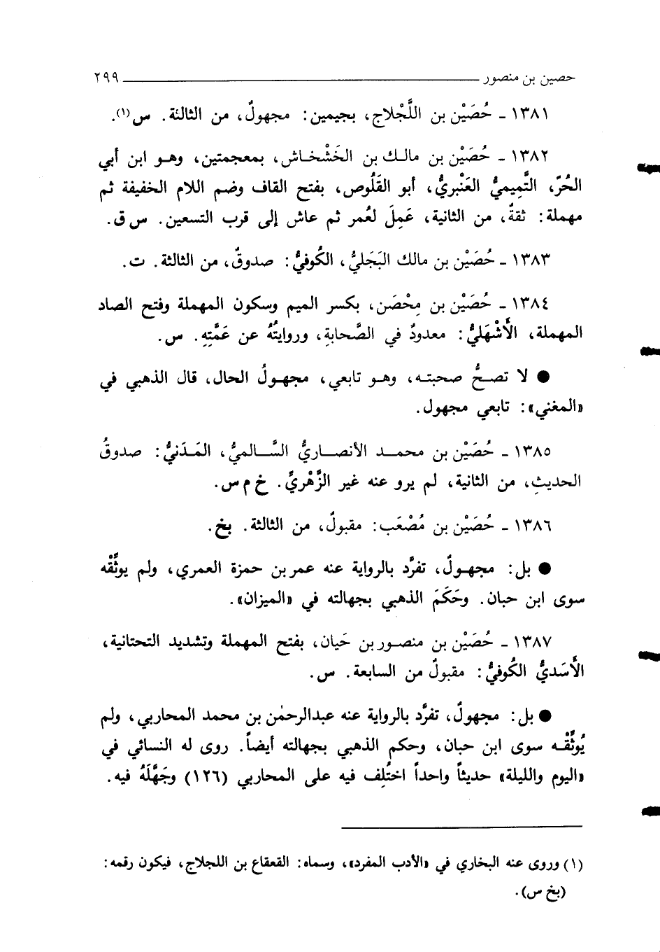 1385 - حُصَيْن بن محمد الأنصاريُّ السَّالميُّ، المَدَنيُّ: صدوقُ الحديثِ، من الثانية، لم يرو عنه غير الزِّهْريِّ. خ م س.
