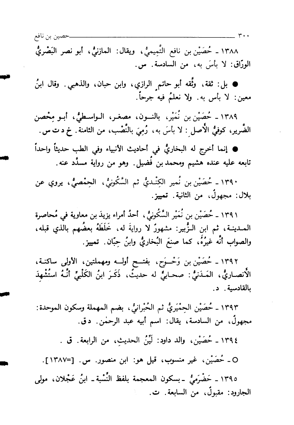 1389 - حُصَيْن بن نُمَيْر، بالنون، مصغر، الواسطيُّ، أبو مِحْصن الضَّرير، كوفيُّ الأَصلِ: لا بأسَ به، رُمِيَ بالنَّصْب، من الثامنة. خ د ت س.