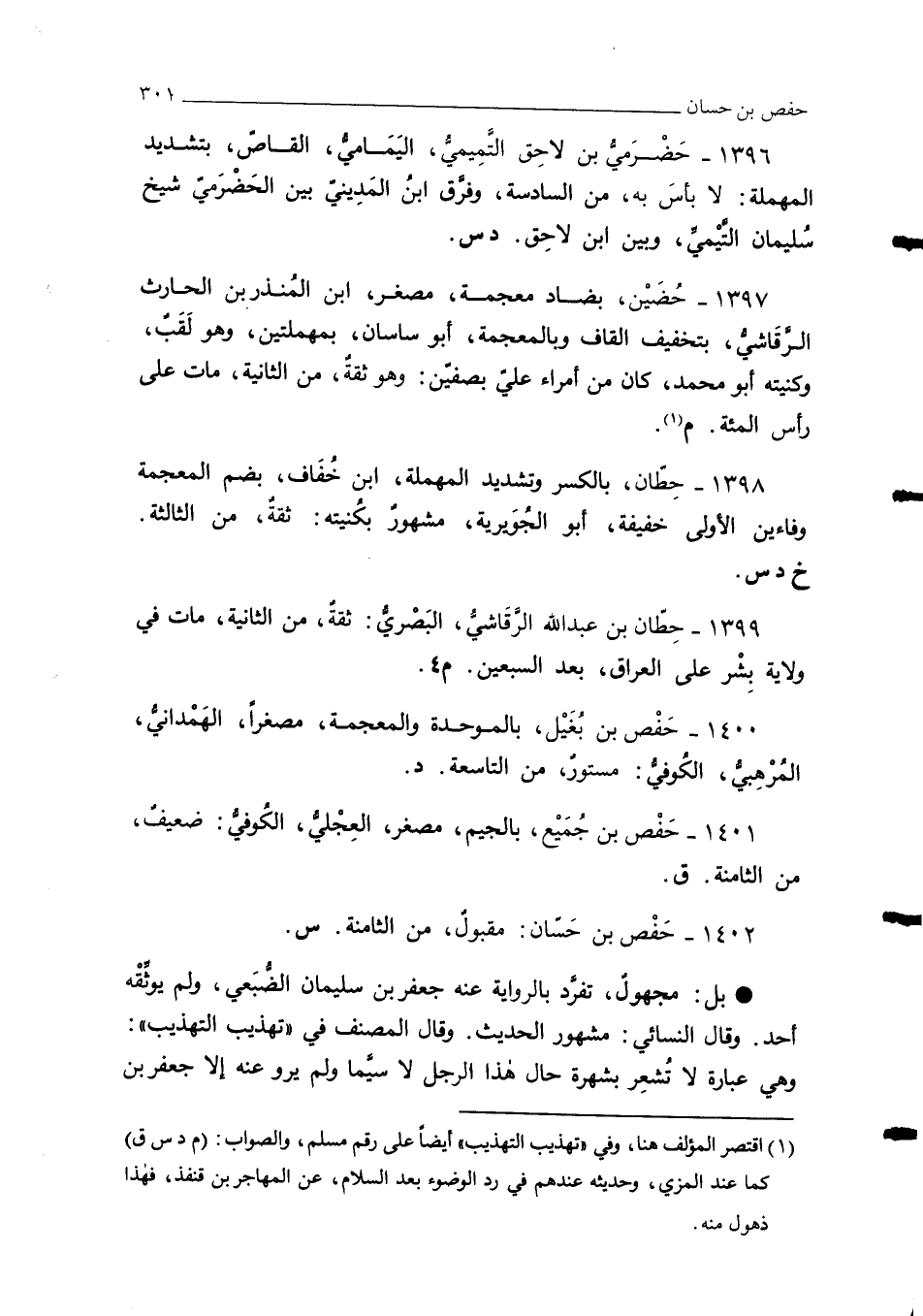 1400 - حَفْص بن بُغَيْل، بالموحدة والمعجمة، مصغرًا، الهَمْداني، المرْهِبي، الكوفي: مشهورٌ، من التاسعة. د.