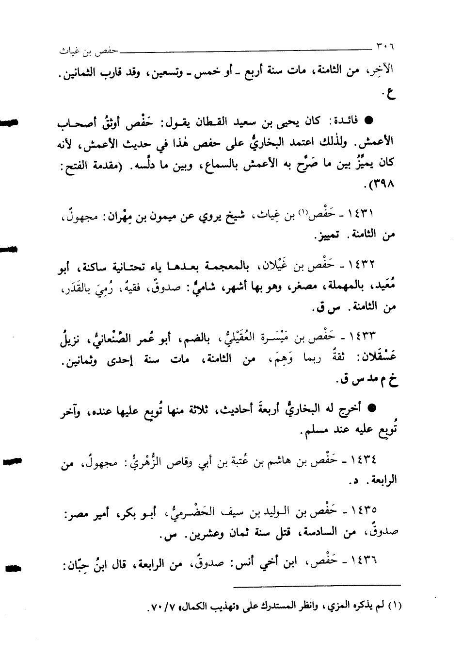 1431 - حَفْص (¬1) بن غِياث، شيح يروي عن ميمون بن مِهْران: مجهول، من الثامنة. تمييز.