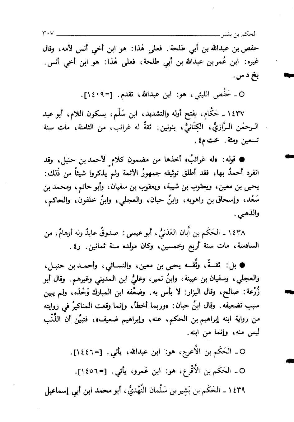1437 - حَكَّام بفتح أوله والتشديد، ابن سلْم، بسكون اللام، أبو عبد الرحمن الرَّازيُّ، الكِنَاني، بنونين: ثقة له غرائب، من الثامنة، مات سنة تسعين ومئة. خت م 4.