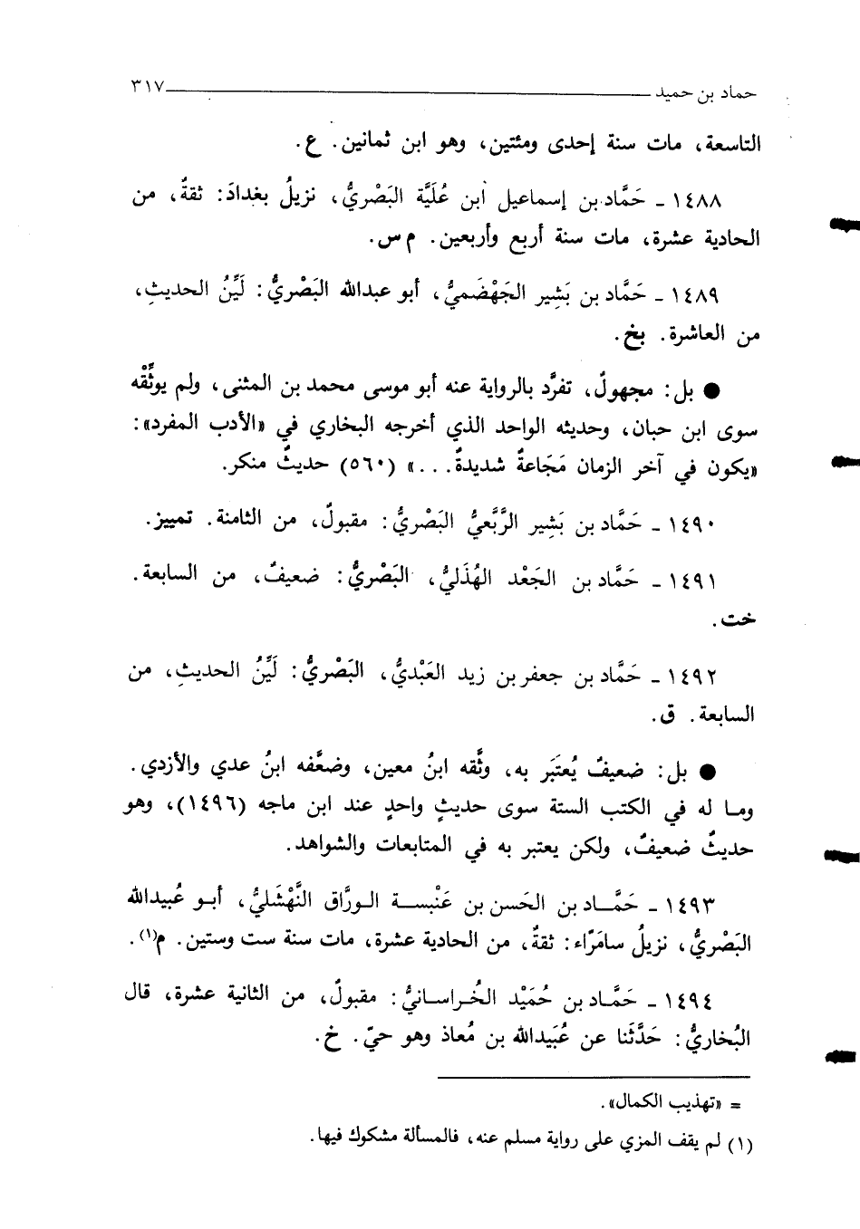 1494 - حَمَّاد بن حُمَيْد الخراساني: مقبول، من الثانية عشرة، قال البُخاريُّ: حَدَّثَنا عن عبَيد الله بن مُعاذ وهو حي. خ.
