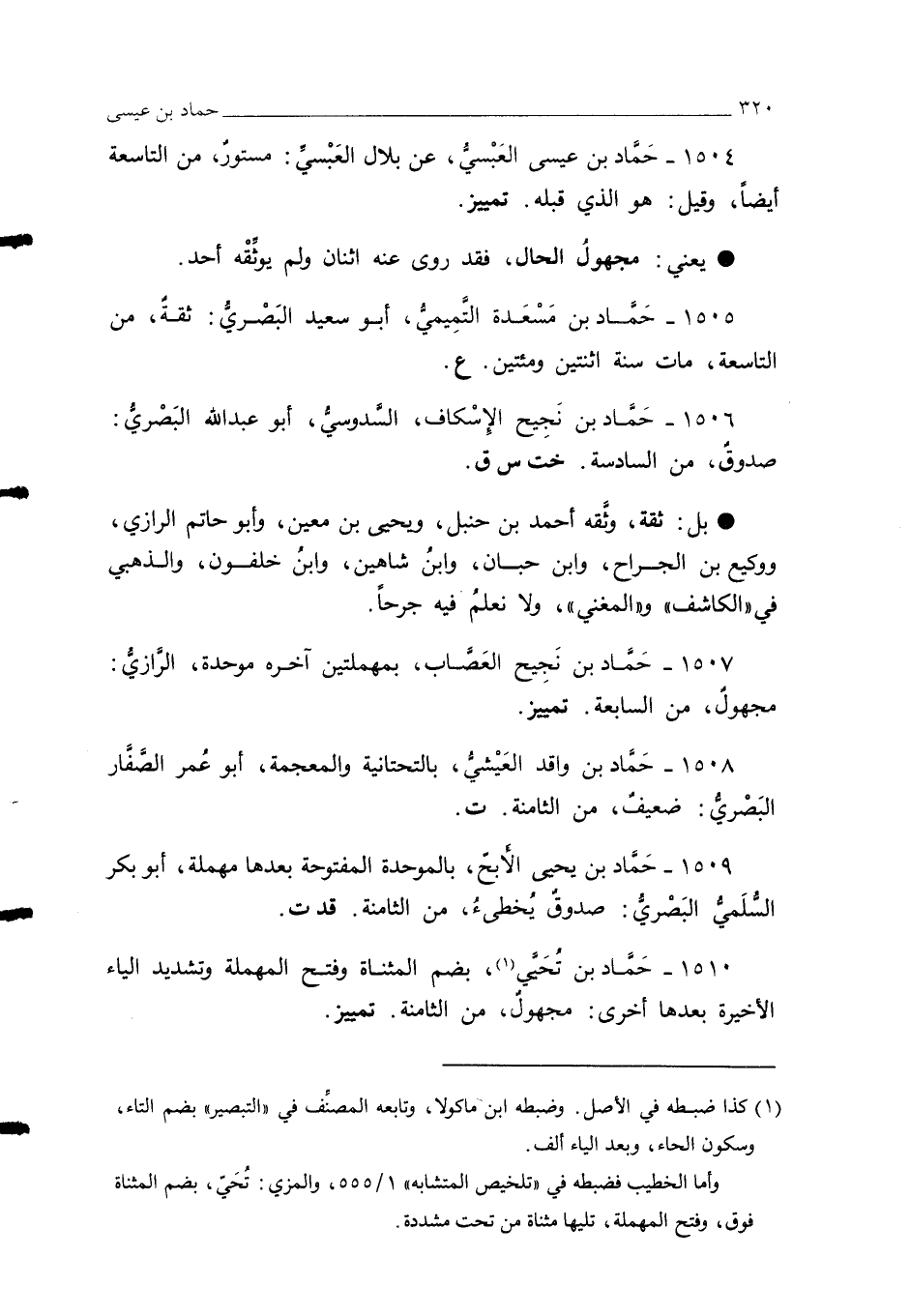 1508 - حَمَّاد بن واقد العَيْشي، بالتحتانية والمعجمة، أبو عُمر الصفار البَصْريُّ: ضعيف، من الثامنة. ت.