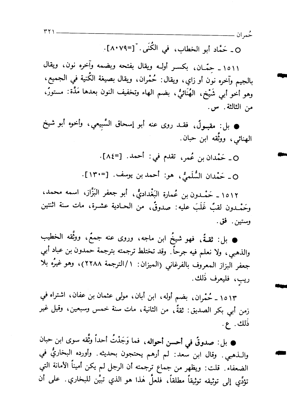 1512 - حَمْدون بن عُمارة البَغْداديُّ، أبو جعفر البَزَّاز، اسمه محمد، وحَمْدون لقبٌ غَلَبَ عليه: صدوقٌ، من الحادية عشرة، مات سنة اثنتين وستين. فق.
