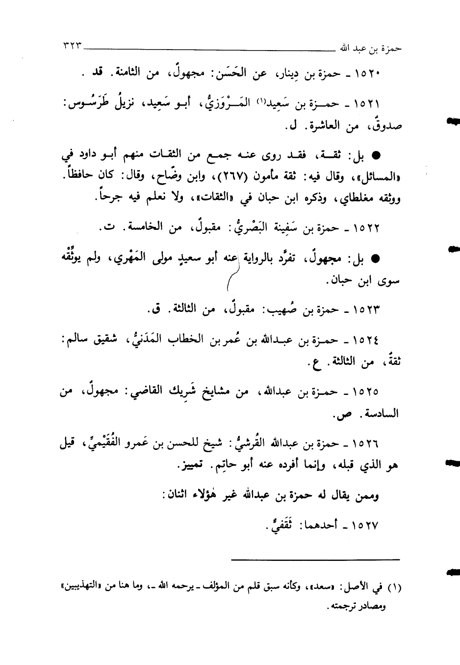 1526 - حمزة بن عبد الله القُرشيُّ: شيخ للحسن بن عَمرو الفُقَيْميّ، قيل هو الذي قبله، وإنما أفرده عنه أبو حاتِم. تمييز.