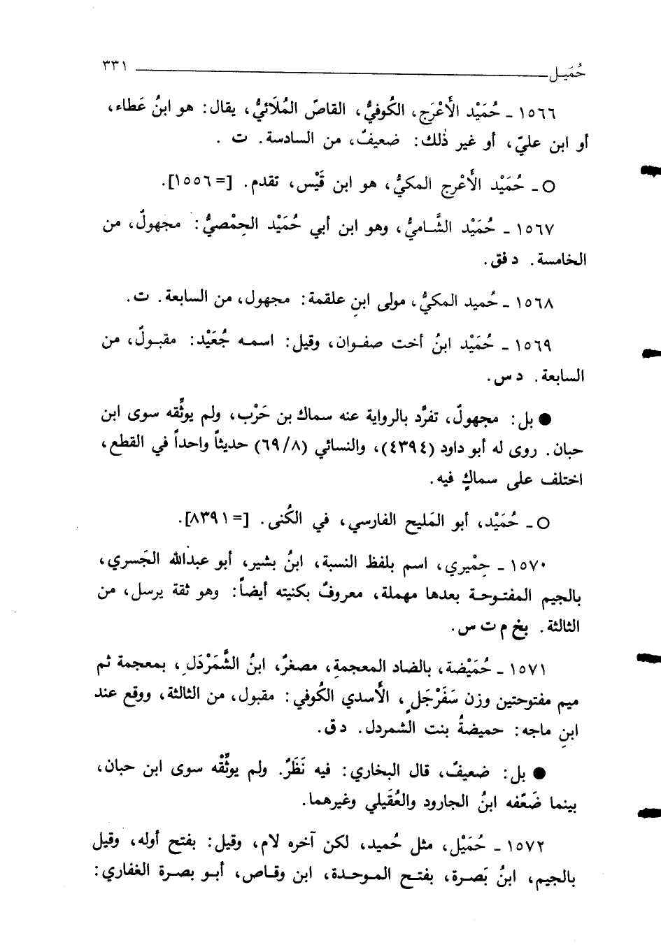 1571 - حُميْضة، بالضاد المعجمةِ، مصغرٌ، ابنُ الشَّمَرْدَلِ، بمعجمة ثم ميم مفتوحتين وزن سَفَرْجَلٍ، الأَسدي الكُوفي: مقبول، من الثالثة، ووقع عند ابنِ ماجه: حميضةُ بنت الشمردل. د ق.