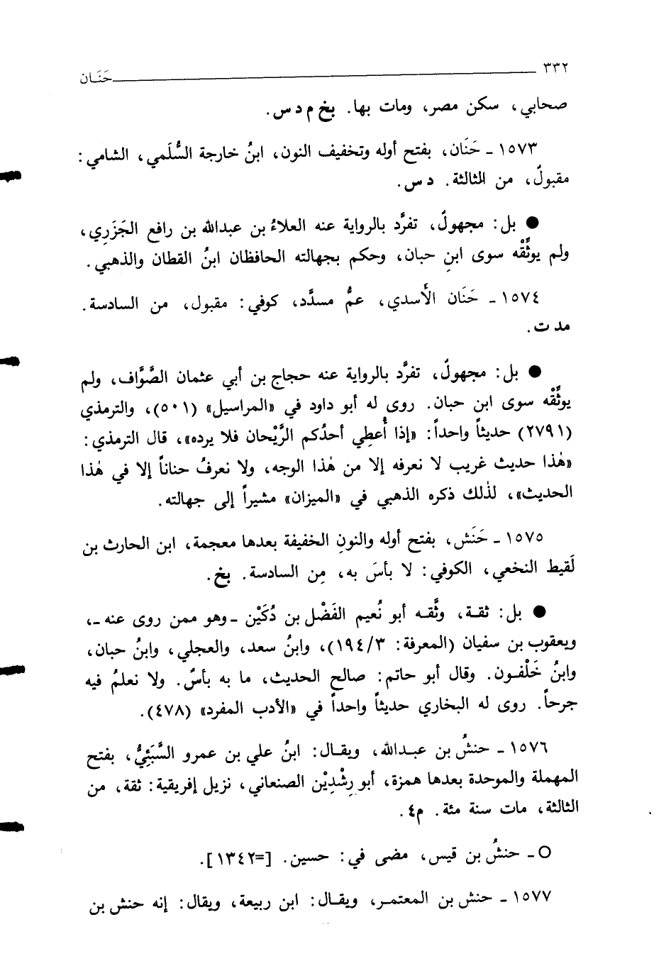 1575 - حَنَش، بفتح أوله والنونِ الخفيفة بعدها معجمة، ابن الحارث بن لَقيط النخعي، الكوفي: لا بأسَ به، مِن السادسة. بخ.
