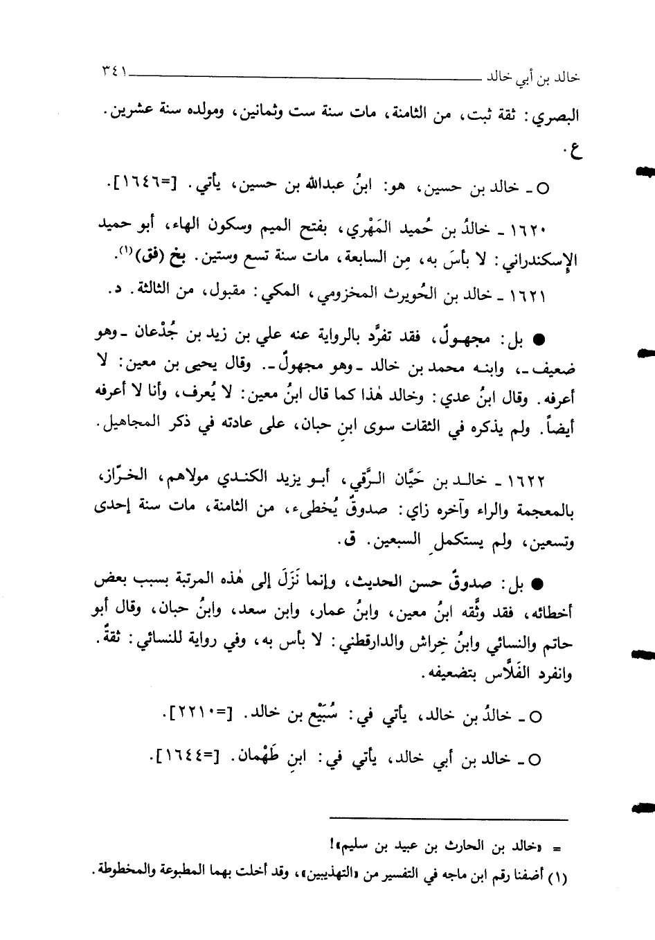 1622 - خالد بن حَيَّان الرَّقي، أبو يزيد الكندي مولاهم، الخرّاز، بالمعجمة والراء وآخره زاي: صدوقٌ يُخطئ، من الثامنة، مات سنة إحدى وتسعين، ولم يستكملِ السبعين. ق.