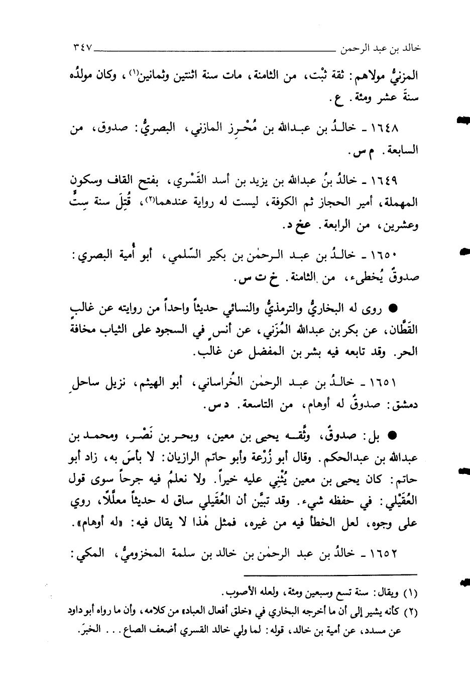1651 - خالد بن عبد الرحمن الخُراساني، أبو الهيثم، نزيل ساحلِ دمشق: صدوقٌ له أوهام، من التاسعة. د س.