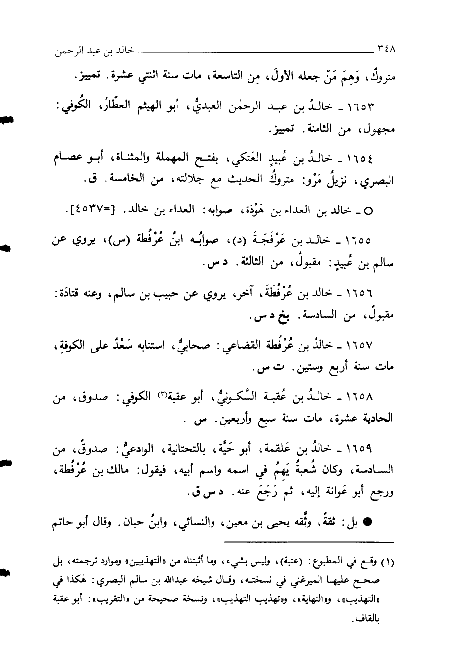 1659 - خالدُ بن عَلقمة، أبو حَيَّة، بالتحتانية، الوادعيُّ: صدوقٌ، من السادسة، وكان شُعبة يَهِمُ في اسمه واسم أبيه، فيقول: مالك بن عُرْفُطة، ورجع أبو عَوانة إليه، ثم رَجَعَ عنه. د س ق.
