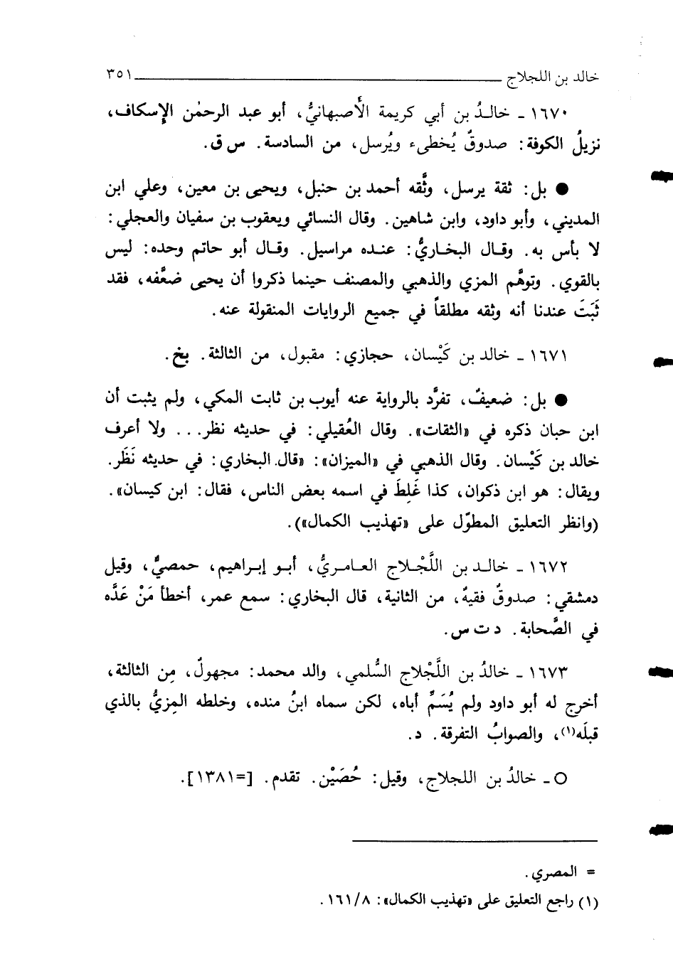 1673 - خالد بن اللجلاج السُّلمي، والد محمد: مجهول، من الثالثة، أخرج له أبو داود ولم يُسم أباه، لكن سماه ابن منده، وخلطه المزيّ بالذي قبله (¬1)، والصواب التفرقة. د.