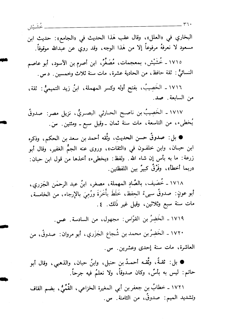 1715 - خُشَيْش، بمعجمات، مُصغَّر، ابن أصرم بن الأسود، أبو عاصم النسائي: ثقة حافظ، من الحادية عشرة، مات سنة ثلاث وخمسين. د س.