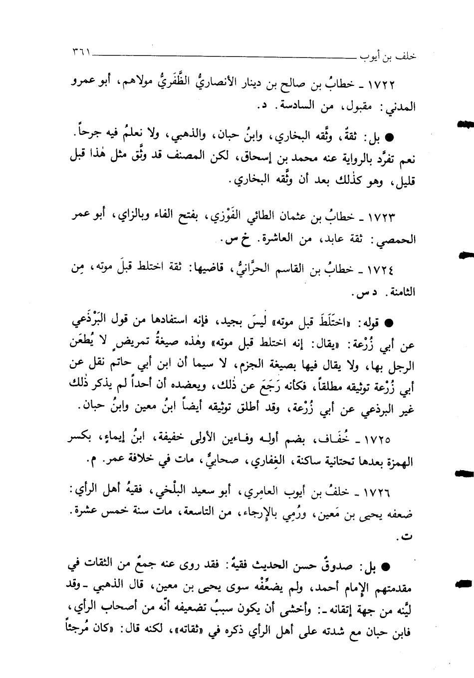 1726 - خلفُ بن أيوب العامِري، أبو سعيد البلْخي، فقيهٌ أهل الرأي: ضعفه يحيى بن مَعين، ورُمِي بالإِرجاء، من التاسعة، مات سنة خمس عشرة. ت.