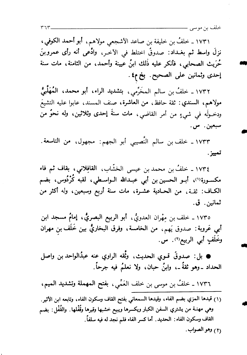 1734 - خلفُ بن محمد بن عيسى الخشّاب، القافِلاني، بقاف ثم فاء مكسورة (¬1)، أبو الحسين بن أبي عبد الله الواسطي، لقبه كُرْدُوس، بضم الكاف: ثقة، من الحادية عشرة، مات سنة أربع وسبعين، وله أكثر من ثمانين. ق.