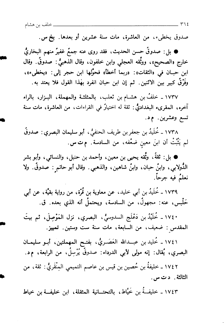 1737 - خلفُ بن هشام بن ثعلب، بالمثلثة والمهملة، البزار، بالراء آخره، المقرئ البغداديُّ: ثقة له أختيارُ في القراءات، من العاشرة، مات سنة تسع وعشرين. م د.