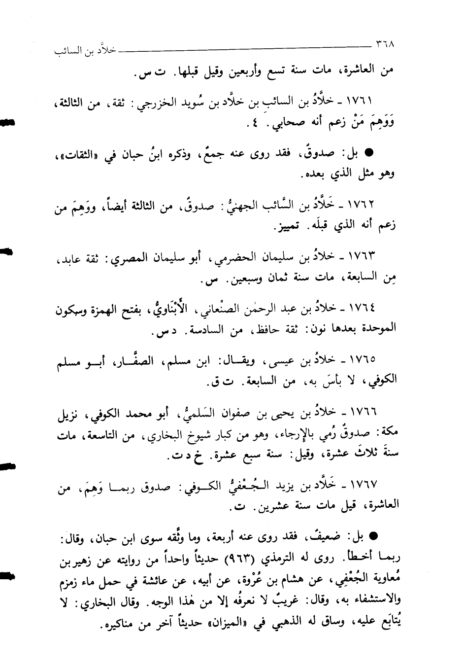 1761 - خلَّادُ بن السائبِ بن خلَّاد بن سويد الخزرجي: ثقة، من الثالثة، وَوَهِمَ مَنْ زعم أنه صحابي. 4.