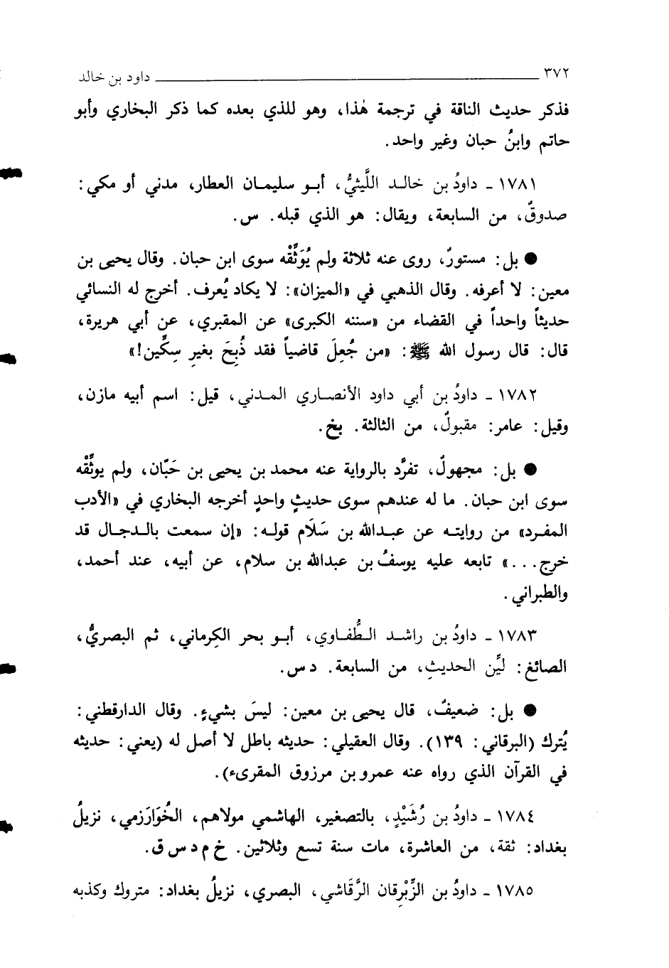 1781 - داودُ بن خالد اللَّيثيُّ، أبو سيمان العطار، مدني أو مكي: صدوقٌ، من السابعة، ويقال: هو الذي قبله. س.