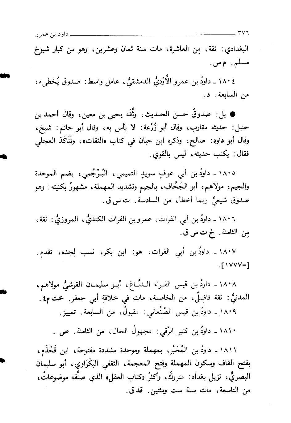 1811 - داودُ بن المُحبَّر، بمهملة وموحدة مشددة مفتوحة، ابن قَحْذَم، بفتح القاف وسكون المهملة وفتح المعجمة، الثقفي البَكْرَاوي، أبو سليمان البصريُّ، نزيل بغداد: متروكٌ، وأكثرُ "كتاب العقل" الذي صنَّفه موضوعاتٌ، من التاسعة، مات سنة ست ومئتين. قد ق.