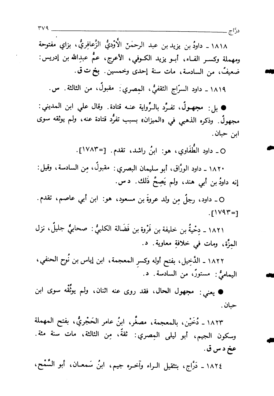 1820 - داود الورَّاق، أبو سليمان البصري: مقبولٌ، مِن السادسة، وقيل: إنه داودُ بن أبي هند، ولم يَصِحَّ ذلك. د س.