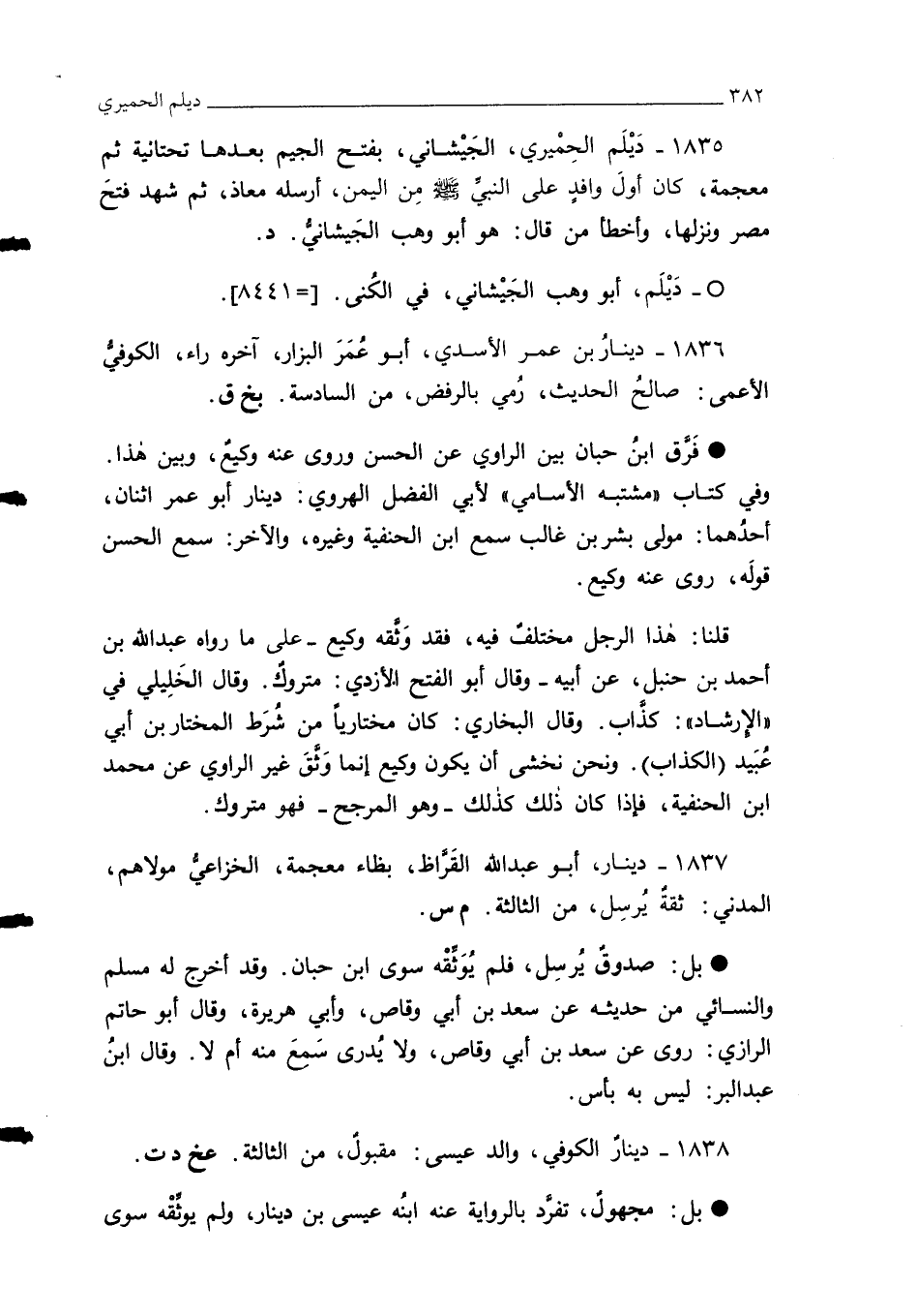 1838 - دينارُ الكوفي، والد عيسى: مقبولٌ، من الثالثة. عخ د ت.