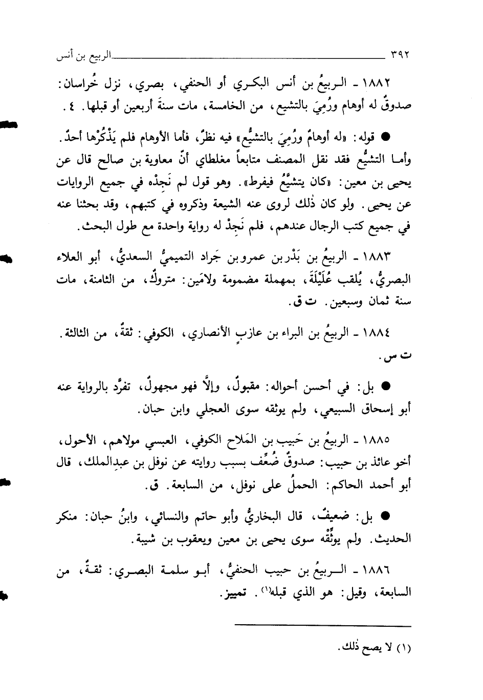 1882 - الربيعُ بن أنس البكري أو الحنفي، بصري، نزل خُراسان: صدوقٌ له أوهام ورُمِيَ بالتشيع، من الخامسة، مات سنةَ أربعين أو قبلها. 4.