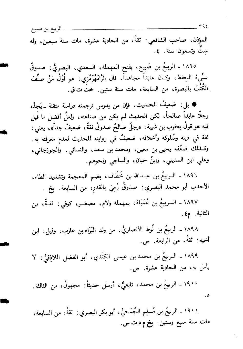 1895 - الربيعُ بن صَبِيح، بفتح المهملة، السعدي، البصريُّ: صدوقٌ سيِّئُ الحِفظ، وكان عابدًا مجاهدًا، قال الرَّامَهُرْمُزِي: هو أَوَّلُ مَنْ صنَّفَ الكُتُبَ بالبصرة، من السابعة، مات سنة ستين. خت ت ق.