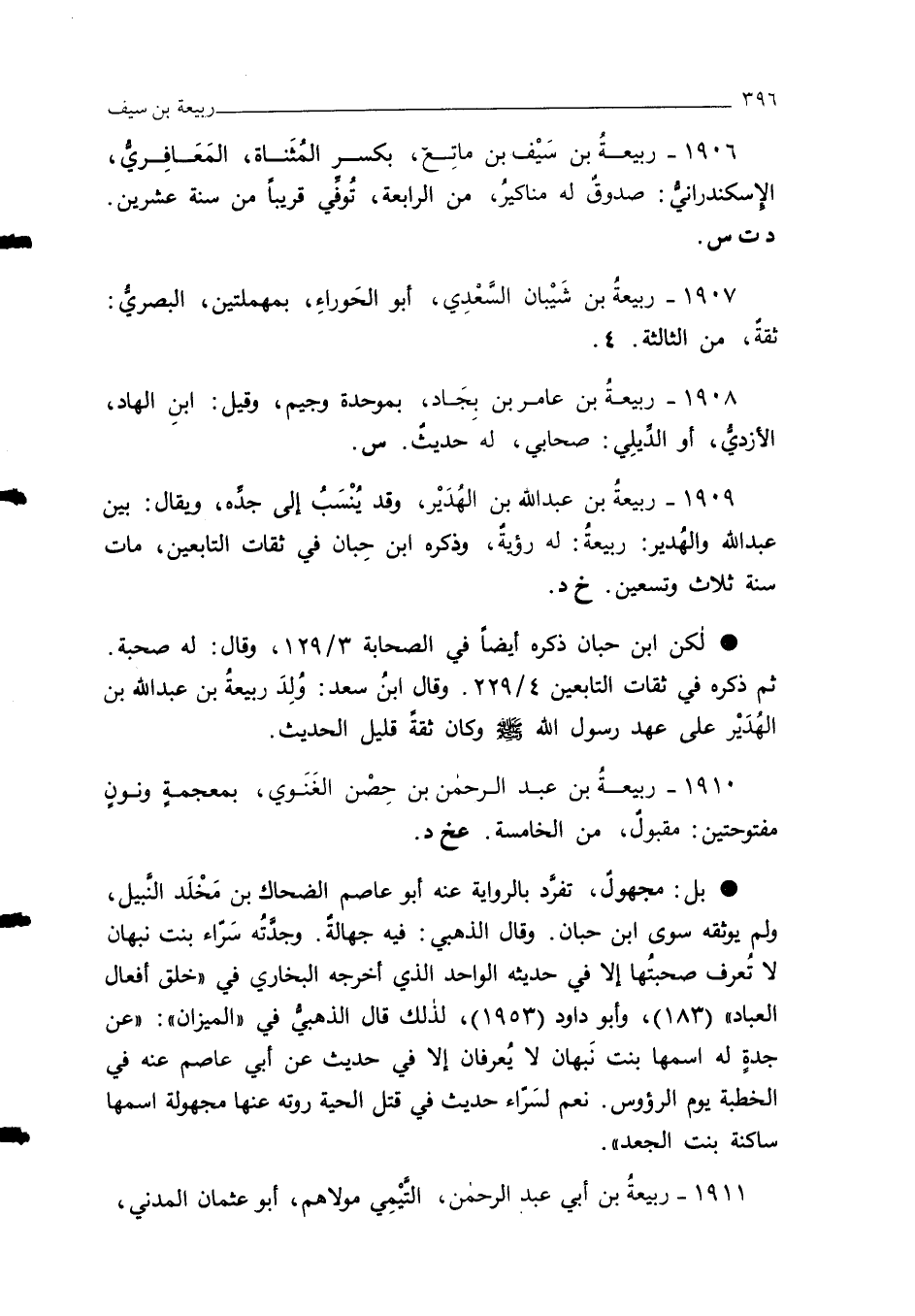 1910 - ربيعةُ بن عبد الرحمن بن حِصْن الغَنَوي، بمعجمةٍ ونونٍ مفتوحتين: مقبولٌ، من الخامسة. عخ د.