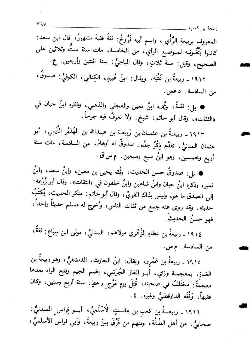 1915 - ربيعةُ بن عَمْرٍو، ويقال: ابنُ الحارث، الدمشقيُّ، وهو ربيعةُ بن الغازِ، بمعجمة وزاي، أبو الغاز الجُرَشي، بضم الجيم وفتح الراء بعدها معجمةٌ: مختَلفٌ في صحبته، قُتِلَ يوم مَرْجِ راهطٍ، سنة أربع وستين، وكان فقيهًا، وَثَّقَه الدارقطنيُّ وغيره. 4.