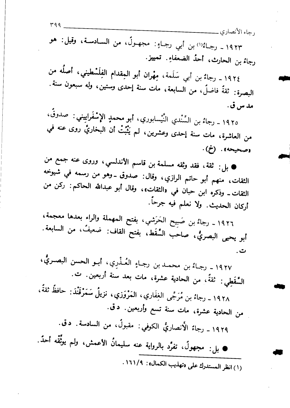 1924 - رجاءُ بن أبي سَلَمة، مِهْران أبو المِقدام الفِلَسْطيني، أصلُه من البصرة: ثقةٌ فاضلٌ، من السابعة، مات سنة إحدى وستين، وله سبعون سنة. مد س ق.