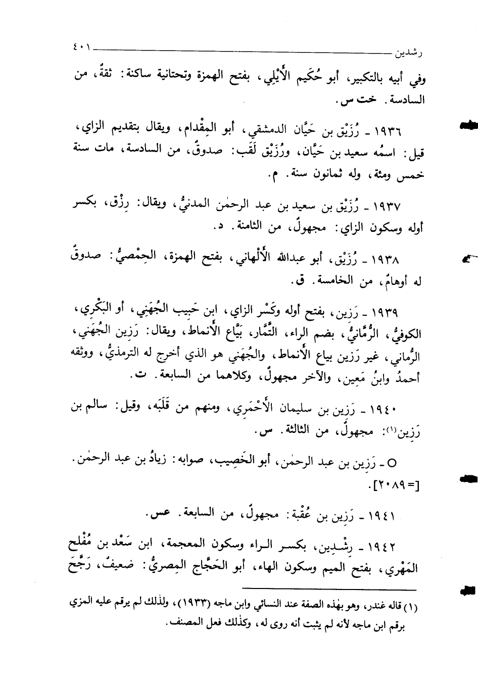 1942 - رِشْدِين، بكسر الراء وسكون المعجمة، ابن سَعْد بن مُفْلح المَهْري، بفتح الميم وسكون الهاء، أبو الحَجَّاج المِصريُّ: ضعيفٌ، رَجَّحَ