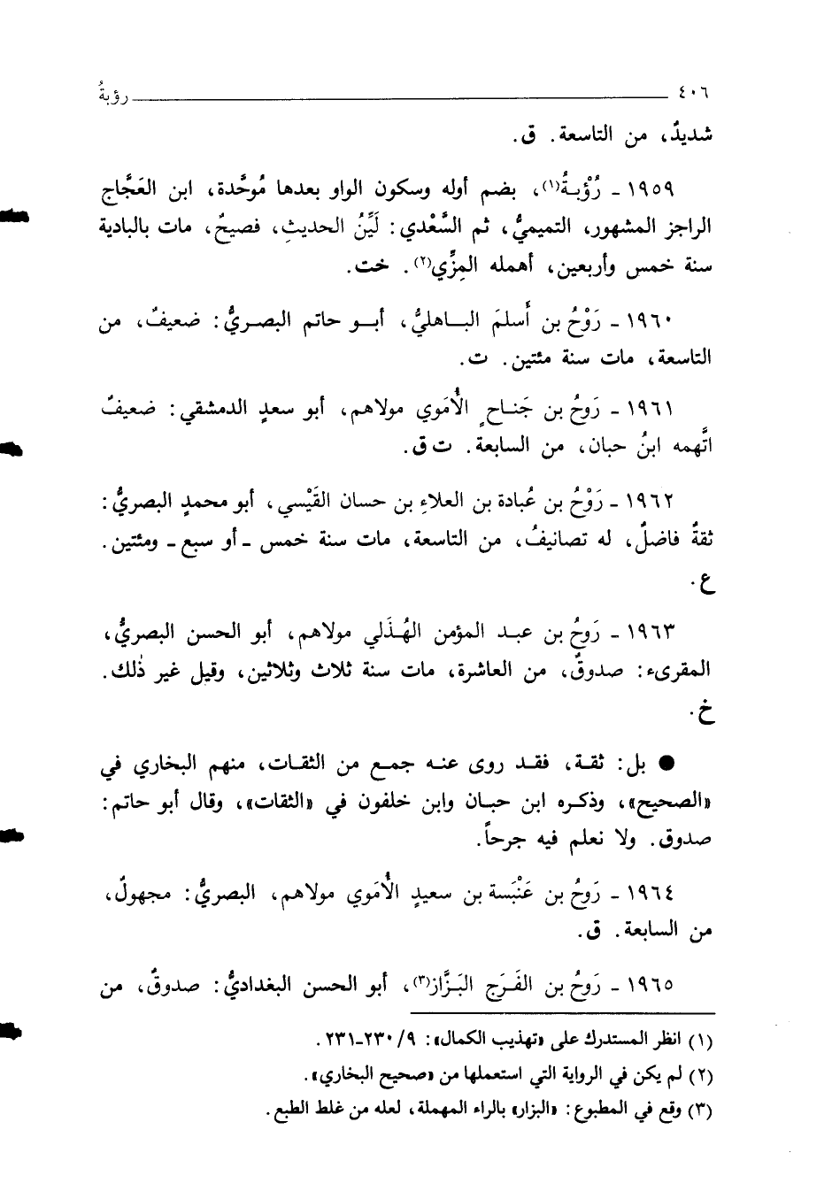 1963 - رَوحُ بن عبد المؤمن الهُذَلي مولاهم، أبو الحسن البصريُّ، المقرئ: صدوقٌ، من العاشرة، مات سنة ثلاث وثلاثين، وقيل غير ذلك. خ.